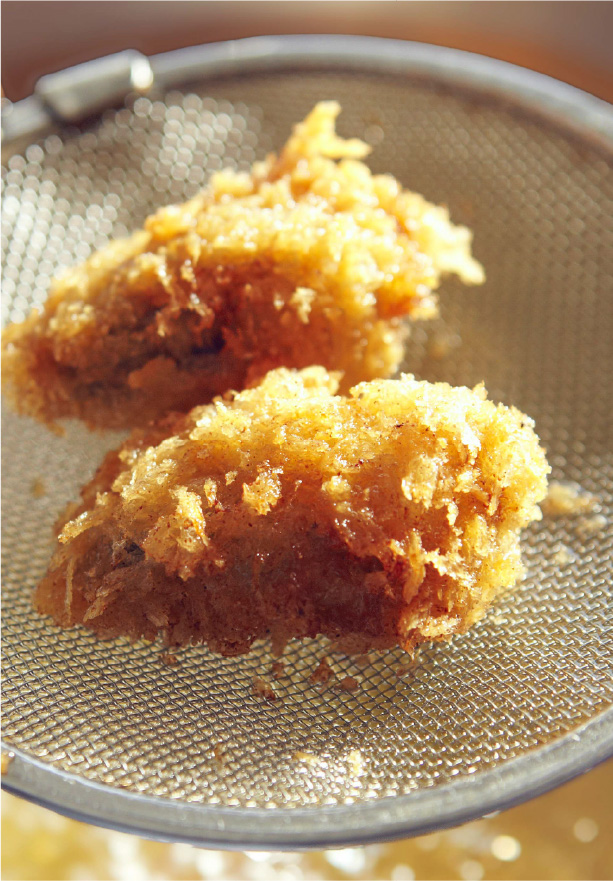 冷凍せずに生の牡蠣だけを使用する理由は、“鮮度こそが牡蠣のおいしさ”だと考えているからです。産地で剥きたての生牡蠣を、ほぼ毎日必要な分だけ仕入れ、旨みを逃さないように丁寧に加工することで、サクッとした食感のあとに広がる、ぷっくりとした身のジューシーさ。手間とコストを惜しまず、海の旨みをそのまま届けているからこそ、衣の中には海の香りと旨みがそのまま閉じ込められています。