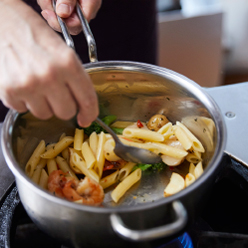 コショウの風味がはっきり効いていて、ご飯にもパスタにも合わせやすい。温めることでハーブの香りがぐっと立ってきます。ポイントはパスタの茹で汁に塩をきっちり効かせること。仕上げにディルを散らして、フレッシュなハーブの風味をプラスしても。