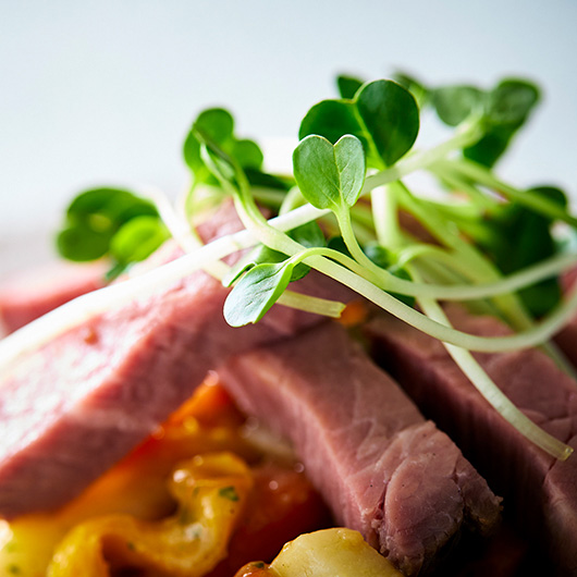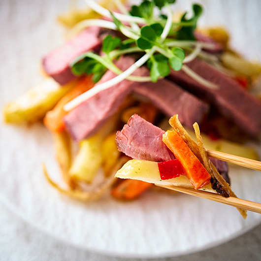 ソースは、ガーリックオイルに、ルッコラやパセリ、バジルなどのハーブを合わせて、風味豊かに。ローストビーフや揚げごぼうと、相性抜群です。
