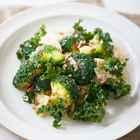 茹でたブロッコリー、焼いたキャベツを、ペペロンチーノソースで。加熱することで甘みを引き出した野菜に、アンチョビの塩味と旨み、にんにくの風味が良く合う一品です。キヌアが食感のアクセント。