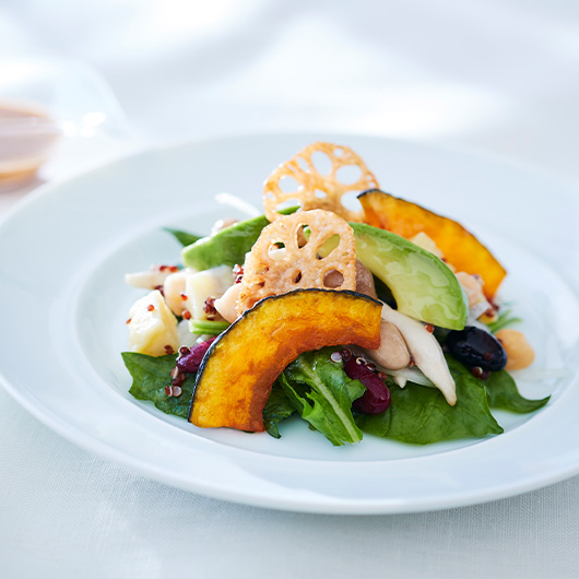 揚げたかぼちゃに、さつまいもやぶなしめじなどの秋を感じる素材や、コクのあるアボカドを組み合わせました。旨みのある「香ばし胡麻ドレッシング」をかけて、お召し上がりください。
