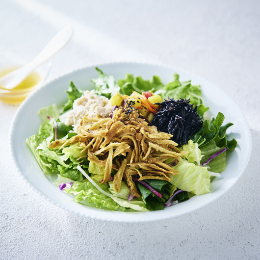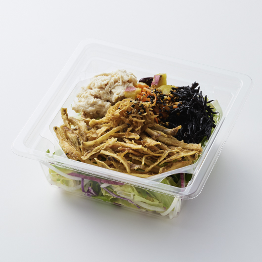 揚げごぼうの香ばしさと蒸し鶏の穏やかな旨みを合わせ、1/3日分の野菜とともに仕立てたサラダです。かつおと昆布のだしに醤油の旨みと柚子の香りを添えたソースが、全体をやさしくまとめます。生姜の佃煮が味わいに変化を添え、最後まで飽きずに楽しめます。