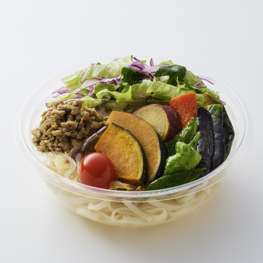 豆乳を加えた優しい味わいのめんつゆドレッシングに、山椒の香りをきかせた鶏そぼろを合わせ、揚げやローストした野菜をのせて仕立てたサラダうどんです。めんつゆドレッシングのまろやかさと山椒の香りが調和し、奥行きを感じられます。ひと皿で満足感のある、ランチにも夕食にもおすすめの一品です。