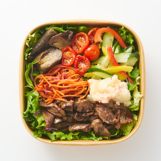 鉄分・亜鉛と一食分の野菜量※を意識したサラダです。柚子胡椒で風味よく仕上げた砂肝に、セミドライトマトや揚げ茄子、ポテトサラダなどを合わせて。爽やかに香る「3種の柑橘おろしドレッシング」が、素材の美味しさを引き立てます。