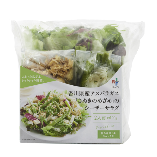 お家で「作るを楽しむ」サラダ。カット&下ごしらえ済みだから、約3分で作れるキットです。香川県産「さぬきのめざめ」を、ベーコンの旨みをまとわせたポテトと合わせました。アスパラは軽くボイルして食感を生かしています。仕上げにクルトンの香ばしさと、さっぱりとしたシーザードレッシングを重ねて、簡単に作りたての味わいを楽しめるひと皿です。